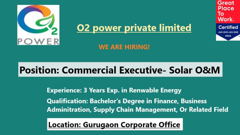 O2 Power Private Limited Careers: New Job Opening for Commercial Executive- Solar O&M | Gurgaon Corporate Office